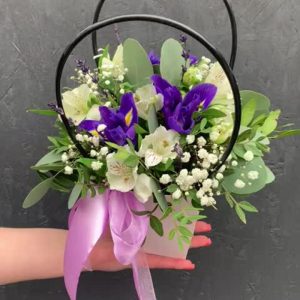 Ирисы с альстромериями, гипсофилой и лавандой с зеленью в сумочке