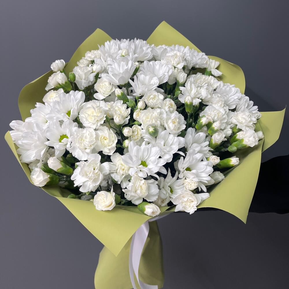 Воздушный букет в белых тонах из ароматной хризантемы и белой кустовой гвоздики придётся по вкусу утонченной натуре.
