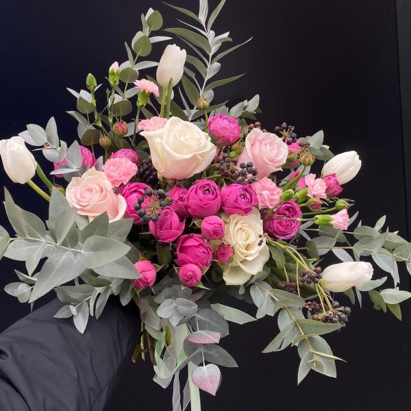 Пионовидная кустовая роза - 9 шт. Роза - 5 шт. Тюльпан - 5 шт. Эвкалипт - 3 шт. Открыточка с вашими пожеланиями - 1 шт. инструкция по уходу за цветами - 1 шт.